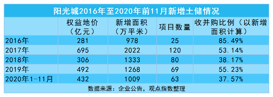 數(shù)據(jù)顯示,2020年前11月,陽光城收并購合作拿地方面占比37.57%,招拍掛占比62.43%。此外,還有較為“隱秘”的舊改。