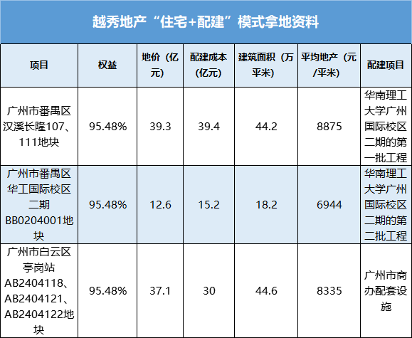 截至10月底,越秀地產(chǎn)通過“住宅+配建”一共拿地3宗,除了前文提及的番禺漢溪地塊,還有廣州番禺區(qū)華工國際校區(qū)二期BB0204001地塊、廣州市白云區(qū)亭崗站AB2404118、AB2404121、AB2404122地塊地塊。