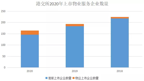 聚焦在港股市場上,2020年港交所共計(jì)上市企業(yè)146家,其中物業(yè)服務(wù)企業(yè)占比12.33%,這一數(shù)據(jù)在2019、2018年分別為4.92%、2.29%。占比逐年拉高,可見在今年整體行情淡薄的情況下,穩(wěn)定現(xiàn)金流與增長預(yù)期的物業(yè)服務(wù)深受市場所青睞,物業(yè)服務(wù)板塊逐漸在資本市場占據(jù)重要地位。