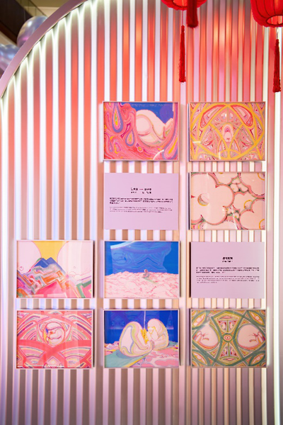 此次“新潮游園記”中重點(diǎn)引用的作品——星球系列,由著名的新水墨藝術(shù)家林于思所作,他從不拘泥于宣紙的想象,在水墨畫(huà)派中獨(dú)樹(shù)一幟的風(fēng)格為傳統(tǒng)作畫(huà)注入現(xiàn)代巧思,并在歷史與現(xiàn)代中找到微妙且平衡的觸點(diǎn)。本次展覽的主展區(qū)M層中庭,一個(gè)外星人形象在他筆下闖入水墨世界探訪地球,展開(kāi)一場(chǎng)中國(guó)潮式拜年之旅,簡(jiǎn)單隨筆的線條與角色,彷若星系自成一格。而廣州太古匯的主題詮釋更與藝術(shù)家的奇思妙想碰撞出了新的火花——中式屋檐、園林拱門(mén)與西式的滑板墻與外星人概念,為現(xiàn)場(chǎng)融入了更多前所未有的元素,創(chuàng)造出中式與西式、傳統(tǒng)與新潮相融合的場(chǎng)景與互動(dòng)形式。顧客步入中庭,穿梭于“除舊布新”、“團(tuán)圓迎春”和“開(kāi)市拜年”的新年故事線,恍若置身于未來(lái)與傳統(tǒng)交匯的平行空間。
