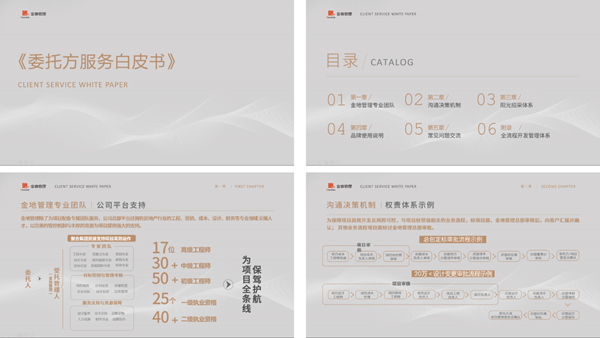 《委托方服務手冊》凝聚了金地管理公司全體員工的專業(yè)核心和心血付出,通過嚴謹?shù)捏w系架構(gòu)、標準的工作流程、清晰的案例呈現(xiàn),向委托方展現(xiàn)一個全方位的專業(yè)體系。手冊不僅展示了金地管理服務的意識和服務的專業(yè),也彰顯了金地管理在服務客戶和價值創(chuàng)造方面的決心和匠心。