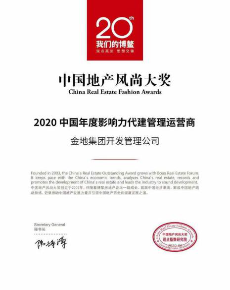 金地管理獲得“2020中國年度影響力代建管理運營商”等品牌榮譽