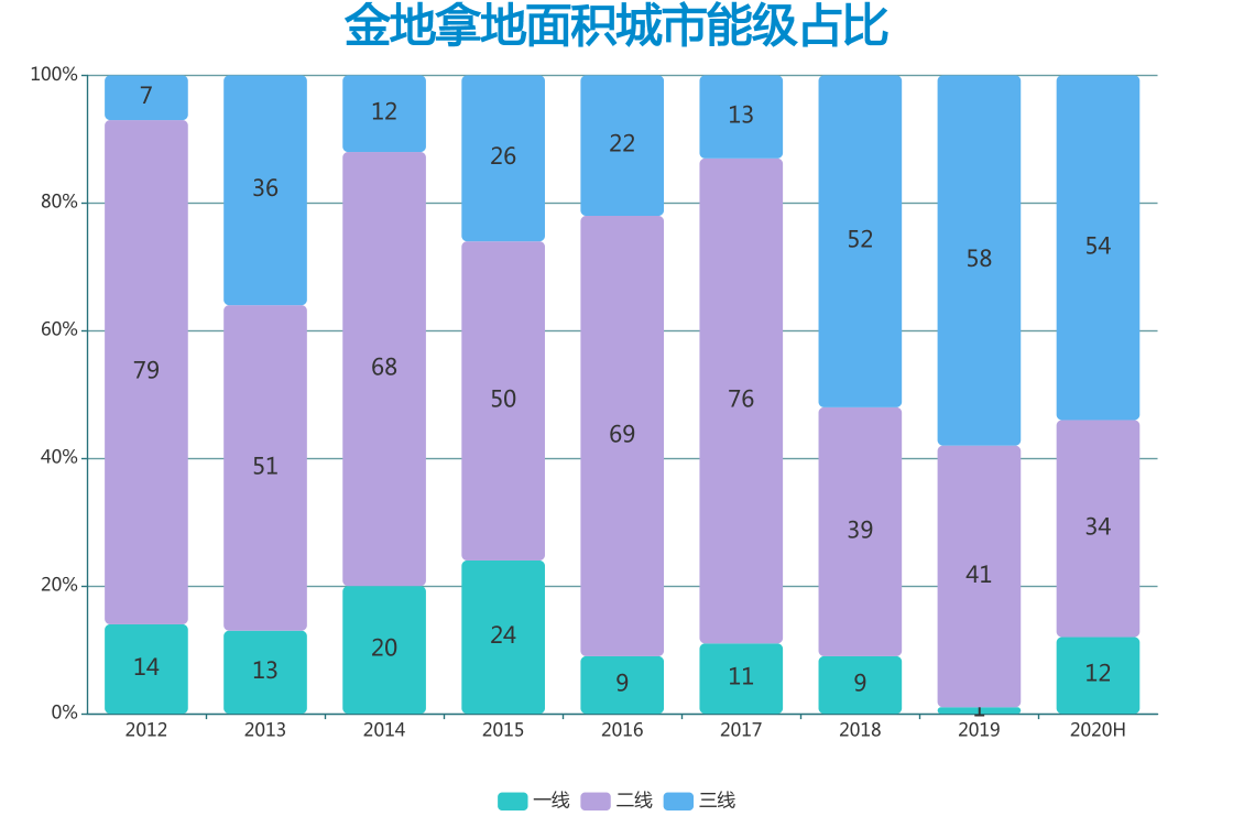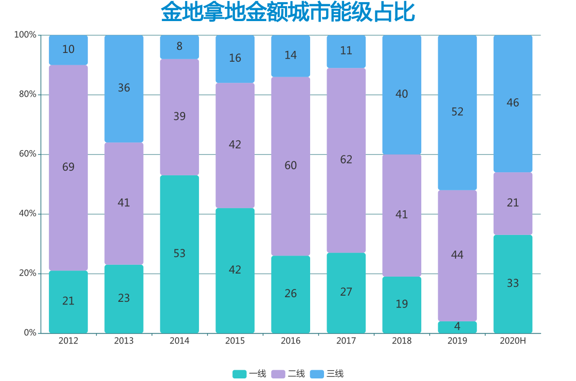 拿地金額占比亦是如此,2018年到2020年半年度,金地三線城市布局金額明顯提高,分別達到40%、52%、46%。