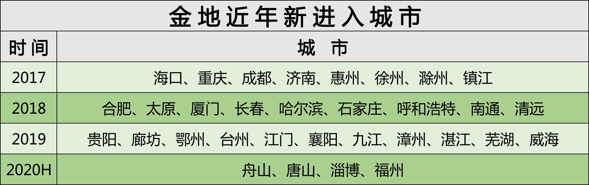 2015年開始,金地開始有意識布局三四線城市,2018年提出“選擇性布局三四線”戰(zhàn)略,2019年進一步提出“堅持了合理布局,深耕一二線城市的同時,適當(dāng)布局具備人口匯聚能力及市場容量的三四線城市”。