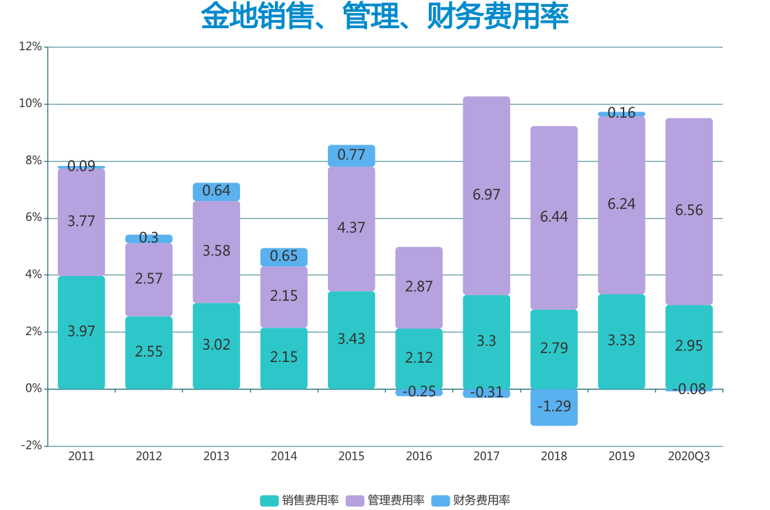 到了2020年三季度,金地管理費用率為6.56%,銷售費用率為2.95%。
