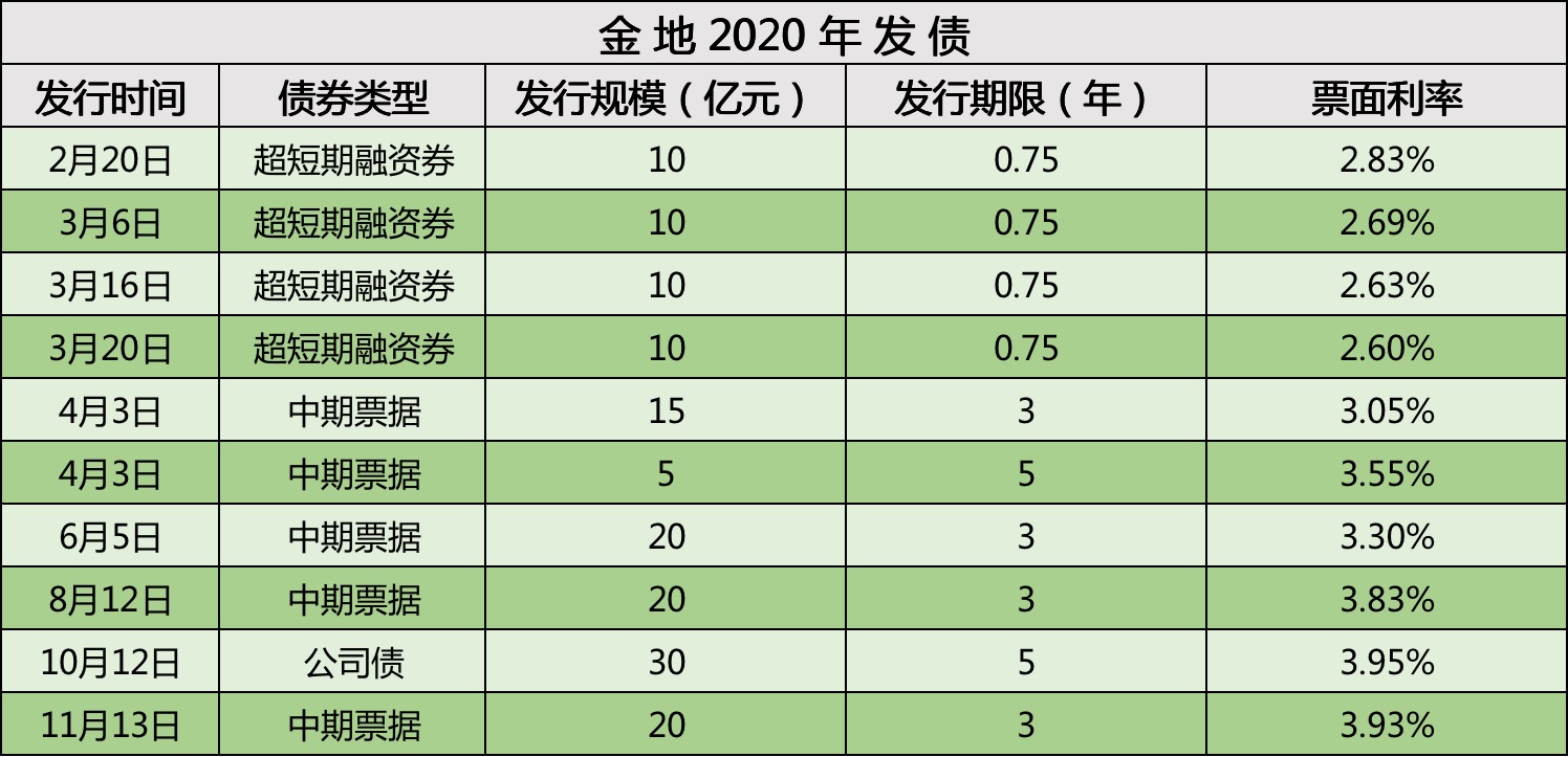 據(jù)觀點新媒體不完全統(tǒng)計,2020年,金地共計發(fā)行10次包含超短期融資債券、中期票據(jù)、公司債等,合共150億元規(guī)模的債券,利率均低于4%。