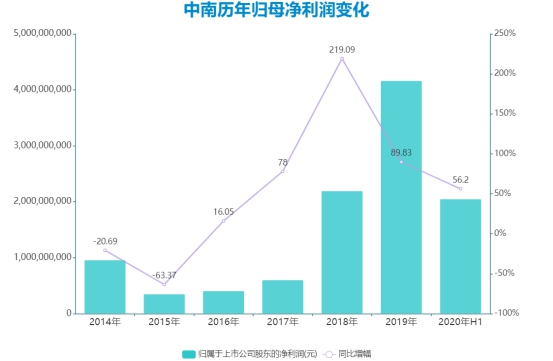 大手筆推動(dòng)下,中南近兩年發(fā)展增速頗為可觀。按其預(yù)期,2020年度歸母凈利潤將達(dá)到60億元-80億元,最高同比增幅達(dá)到了92.17%。