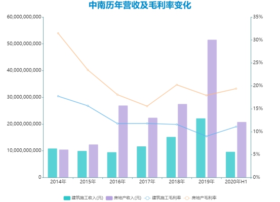 數(shù)據(jù)顯示,2016年-2019年以及2020年上半年里,中南建設(shè)地產(chǎn)業(yè)務(wù)分別錄得毛利率18.08%、15.57%、20.23%、17.93%、19.4%;該水平遠(yuǎn)低于以證監(jiān)會(huì)標(biāo)準(zhǔn)統(tǒng)計(jì)的A股上市地產(chǎn)公司毛利率平均值。