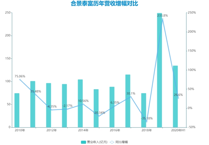 同樣表現(xiàn)較大波動性的是營收增幅:2019年合景泰富實現(xiàn)營收249.56億元,同比增長233.8%;2020年上半年營收134.83億元,同比增長26.6%。