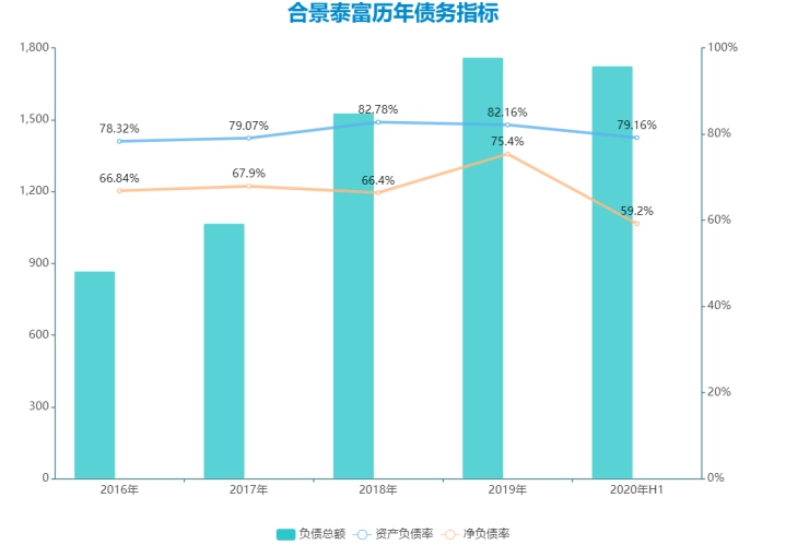 2017年,合景泰富資產(chǎn)負(fù)債率與行業(yè)平均水平一致,2018年則突破80%升至82.78%;2019年剔除預(yù)收款后的資產(chǎn)負(fù)債率為80.78%;凈負(fù)債率同樣不降反升,由2018年的66.4%升至2019年75.4%。