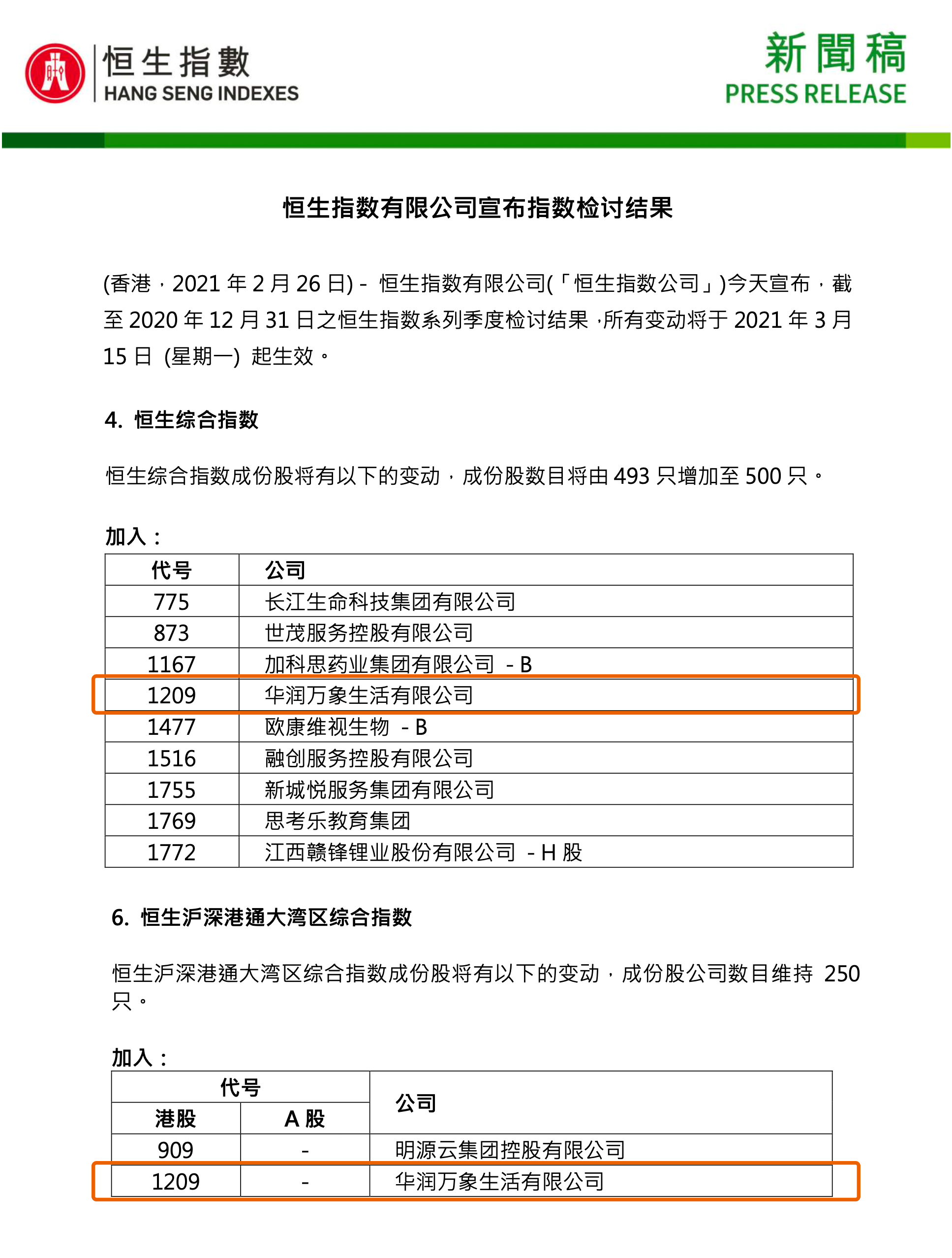 2月26日,香港恒生指數(shù)有限公司發(fā)布公告,宣布截至2020年12月31日之恒生指數(shù)系列季度檢討結(jié)果,將華潤置地旗下華潤萬象生活有限公司(1209.HK)納入恒生綜合指數(shù)成份股(共500只)和恒生滬深港通大灣區(qū)綜合指數(shù)成份股(共250只),并于2021年3月15日(星期一)生效,這意味著登陸國際資本市場近三月,華潤萬象生活以全業(yè)態(tài)、全客戶、全產(chǎn)品與全服務(wù)一體化生態(tài)體系為特色的業(yè)務(wù)模式獲得了資本市場認(rèn)可。