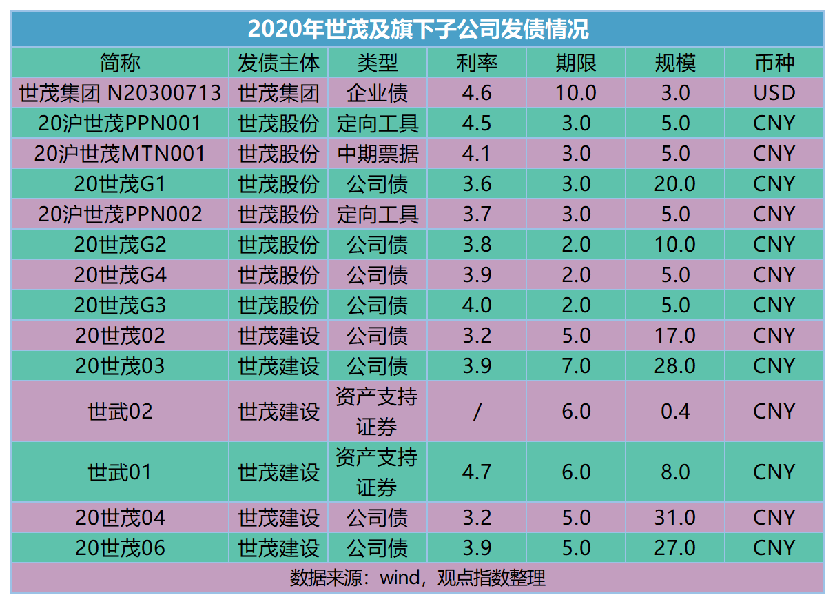 據(jù)觀點指數(shù)統(tǒng)計,世茂集團2020年通過港股上市平臺僅發(fā)行一筆美元債,年限10年、利率僅為4.8%。而世茂股份和上海世茂建設(shè)的融資動作頻頻,方式也較為多元化,除了公司債、票據(jù)等,還包括CMBS、ABS等途徑。
