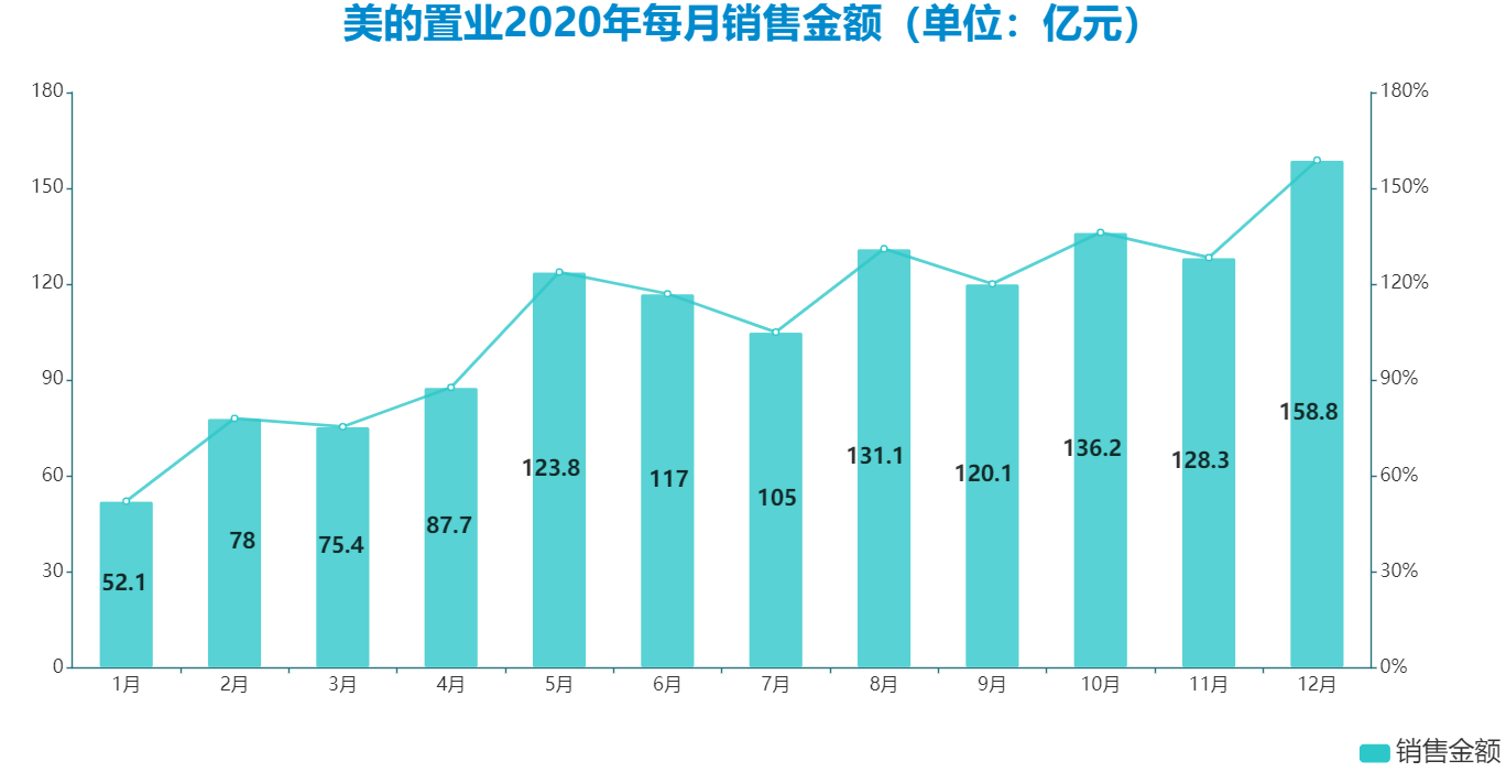 和大部分房企在2020年的表現(xiàn)一致,美的置業(yè)上半年銷售處于全年低位,然后一路上揚(yáng),年末達(dá)到全年高位水平。