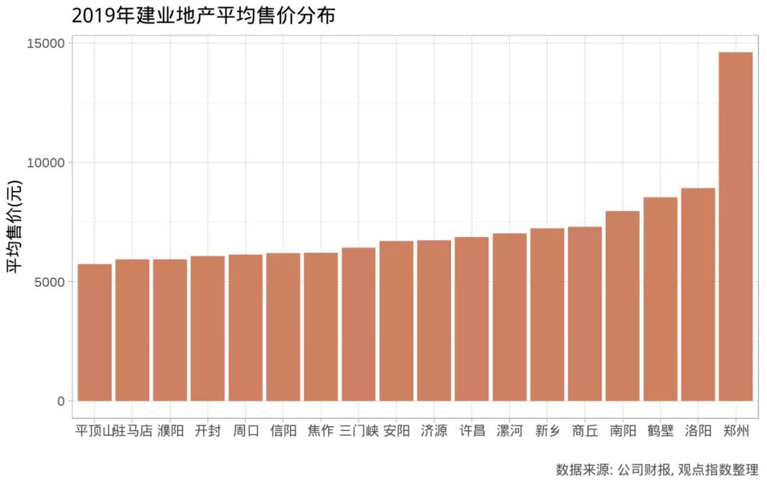 根據(jù)建業(yè)地產(chǎn)2019年年報披露,建業(yè)地產(chǎn)在河南布局城市除鄭州為二線城市外,其余均為三四線城市。售價方面,除鄭州平均售價達14611元/平方米外,其余城市平均售價均在1萬元/平方米以下,大部分低于7500元/平方米,平均售價為6888.8元/平方米。