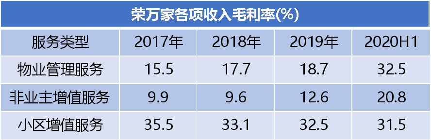 仔細(xì)查看榮萬(wàn)家的各項(xiàng)收入及毛利率,可以清楚看到2020年上半年物業(yè)管理服務(wù)和非業(yè)主增值服務(wù)毛利大升。