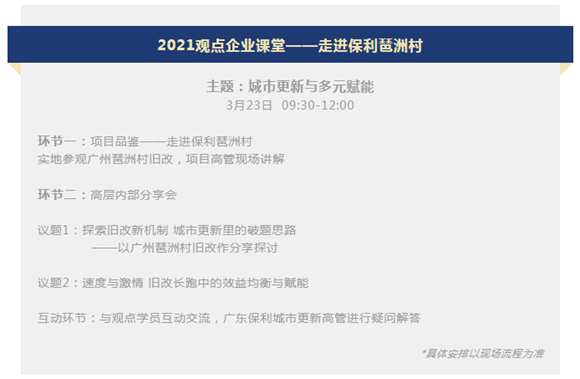 最后一個環(huán)節(jié)是高層內(nèi)部分享會,屆時,來自廣東保利城市更新的高層將與觀點(diǎn)學(xué)員面對面:以廣州琶洲村舊改作為范例,分享這一標(biāo)志性項目的誕生;以舊改長跑中的關(guān)系博弈與效益平衡為話題,探討如何讓資金滾動起來,如何從面貌到經(jīng)濟(jì)上真正激發(fā)一個片區(qū)的活力與長久發(fā)展。