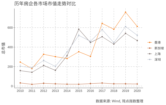 同時(shí)可以發(fā)現(xiàn),內(nèi)地上市房企平均總市值在2015左右出現(xiàn)增長(zhǎng)停滯,這也與內(nèi)地股市同期的不佳表現(xiàn)相契合。
