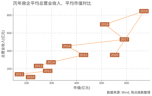 與房企營(yíng)業(yè)總收入對(duì)比,可發(fā)現(xiàn)平均市值與平均總營(yíng)業(yè)收入呈現(xiàn)正的相關(guān)性??梢宰⒁獾剑?020年受到疫情影響,無(wú)論是總營(yíng)業(yè)收入還是市值都出現(xiàn)顯著下挫。
