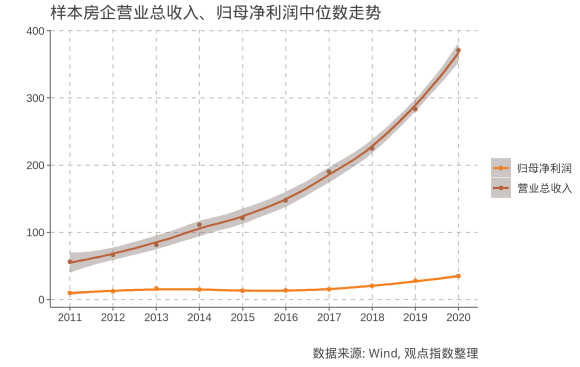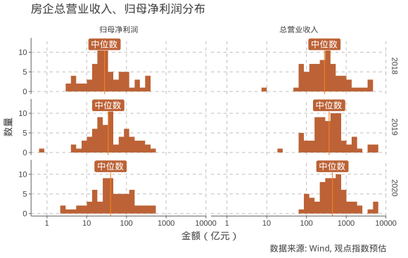 另一方面,觀點(diǎn)指數(shù)預(yù)計(jì)樣本房企歸母凈利潤(rùn)中位數(shù)在2020年將達(dá)到40億元,同比上漲15.2%,漲幅不及營(yíng)業(yè)收入;而歸母凈利潤(rùn)均值為78.9億元,同比上升10.0%。