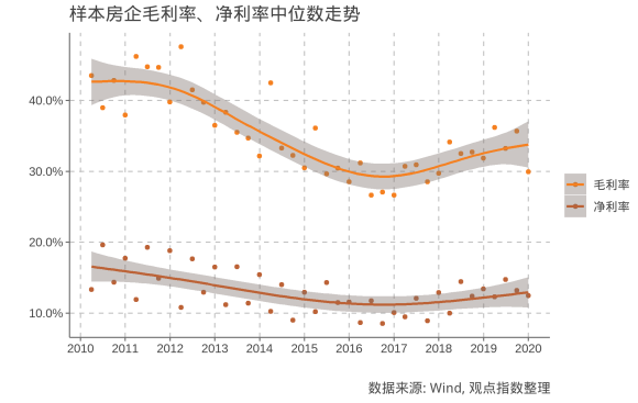 從圖中可以看到,2017年以后房企毛利率出現(xiàn)反彈,除受到2015-2016年房?jī)r(jià)上漲影響外,一定程度上也表現(xiàn)出房地產(chǎn)行業(yè)的韌性,即房企不斷對(duì)新利潤(rùn)增長(zhǎng)點(diǎn)進(jìn)行探索,未來(lái)可能會(huì)出現(xiàn)更多震蕩調(diào)整。