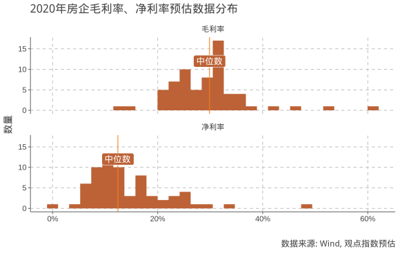 觀點(diǎn)指數(shù)預(yù)計(jì)2020年樣本房企毛利率中位數(shù)為29.4%,較2019年下降0.6個(gè)百分點(diǎn);凈利率中位數(shù)則為12.8%,較2019年小幅提升0.3個(gè)百分點(diǎn)。