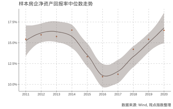 根據(jù)觀點(diǎn)指數(shù)預(yù)估,樣本房企2020年凈資產(chǎn)收益率(ROE)平均約為15.5%,中位數(shù)15.0%。