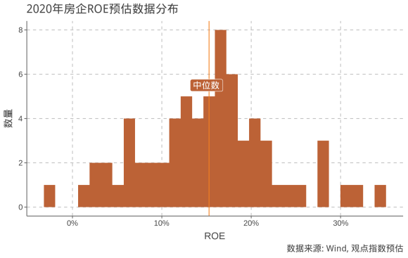 從數(shù)據(jù)分布情況看,大多數(shù)房企ROE分布在10%-20%區(qū)間,預(yù)計(jì)僅三家房企2020年ROE有望超過(guò)30%。