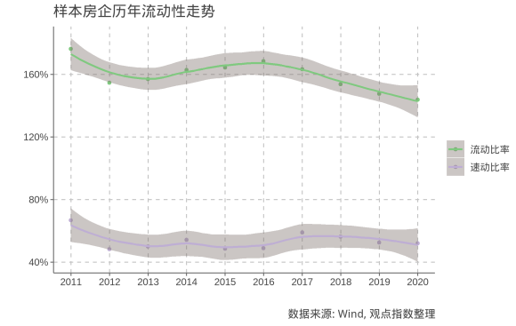 觀點(diǎn)指數(shù)預(yù)計(jì),樣本房企2020年末流動(dòng)比率水平與2019年年末基本持平,中位數(shù)大約1.42,小幅低于2019年中位數(shù)1.44;而速動(dòng)比率約為0.55,略優(yōu)于2019年的0.52。