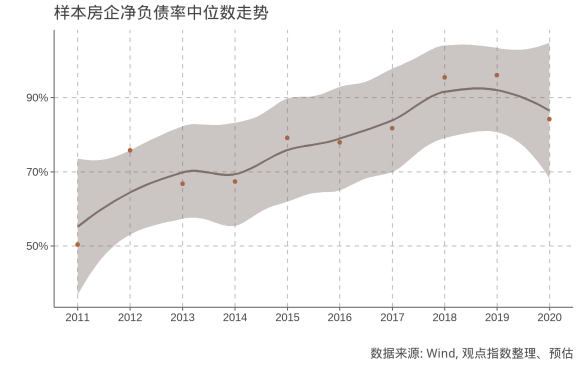 與流動(dòng)性趨勢(shì)相對(duì)應(yīng)的是負(fù)債的增長(zhǎng),根據(jù)樣本房企過(guò)去10年凈負(fù)債率中位數(shù)走勢(shì),行業(yè)平均負(fù)債水平已從2010年的47.8%上升到2019年末的79.7%。