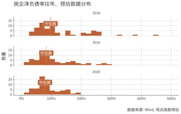 觀點(diǎn)指數(shù)預(yù)測(cè),2020年房企凈負(fù)債率中位數(shù)將繼續(xù)下降至75.0%;隨著凈負(fù)債率分布右側(cè)厚尾現(xiàn)象緩解,樣本房企凈負(fù)債率平均值預(yù)計(jì)將首次降至100%以下,至87.6%。