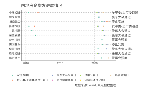 根據(jù)市場(chǎng)數(shù)據(jù),包括新城控股、榮盛發(fā)展等房企最早自2016年便開始籌劃增發(fā)預(yù)案,但截至目前仍沒有進(jìn)入實(shí)施階段。同時(shí),有兩家房企的增發(fā)預(yù)案正式停止實(shí)施。