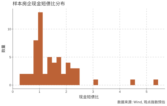 根據(jù)觀點(diǎn)指數(shù)預(yù)估,66家樣本上市房企的現(xiàn)金短債比多分布在1-2的區(qū)間范圍,而少數(shù)房企擁有充足的現(xiàn)金水平來償付短期有息債務(wù)。值得注意的是,該指標(biāo)沒有考慮應(yīng)付賬款等短期商業(yè)信用的償付壓力。