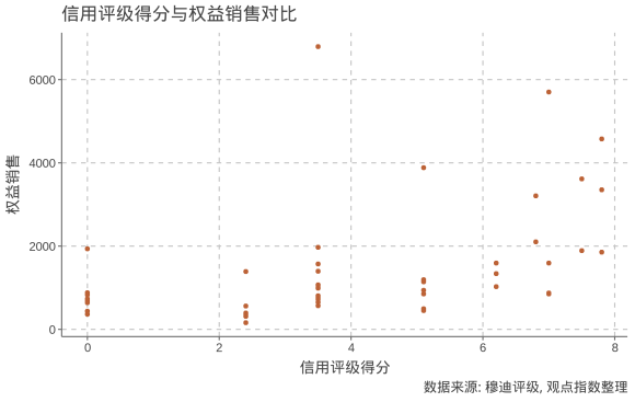 觀點(diǎn)指數(shù)根據(jù)穆迪評(píng)級(jí)機(jī)構(gòu)對(duì)上市房企的信用評(píng)級(jí)(指發(fā)行人評(píng)級(jí)或企業(yè)家族評(píng)級(jí))進(jìn)行打分,并將其房企的權(quán)益銷售進(jìn)行對(duì)比,可發(fā)現(xiàn)統(tǒng)計(jì)顯現(xiàn)出顯著的相關(guān)關(guān)系:Spearman相關(guān)系數(shù)為0.70,p值接近0,意味著該相關(guān)性通過顯著性檢驗(yàn)。