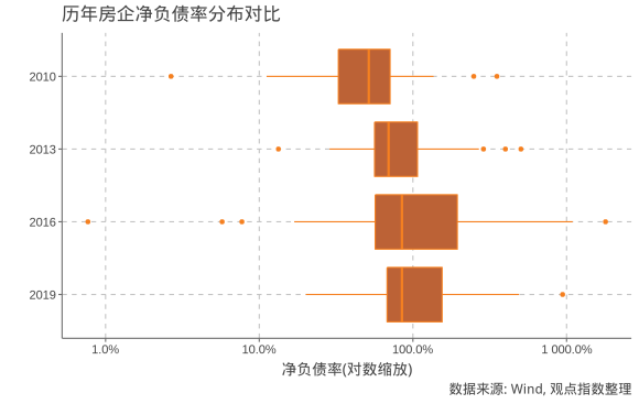 從房企資本結(jié)構(gòu)來(lái)看,凈負(fù)債率在過(guò)去10年呈現(xiàn)攀升趨勢(shì),2010年超過(guò)75%房企都沒(méi)有超過(guò)100%的“紅線”;從2013年開(kāi)始,越來(lái)越多房企越過(guò)了100%的“紅線”,截至2019年年末,樣本房企凈負(fù)債率約為85%。
