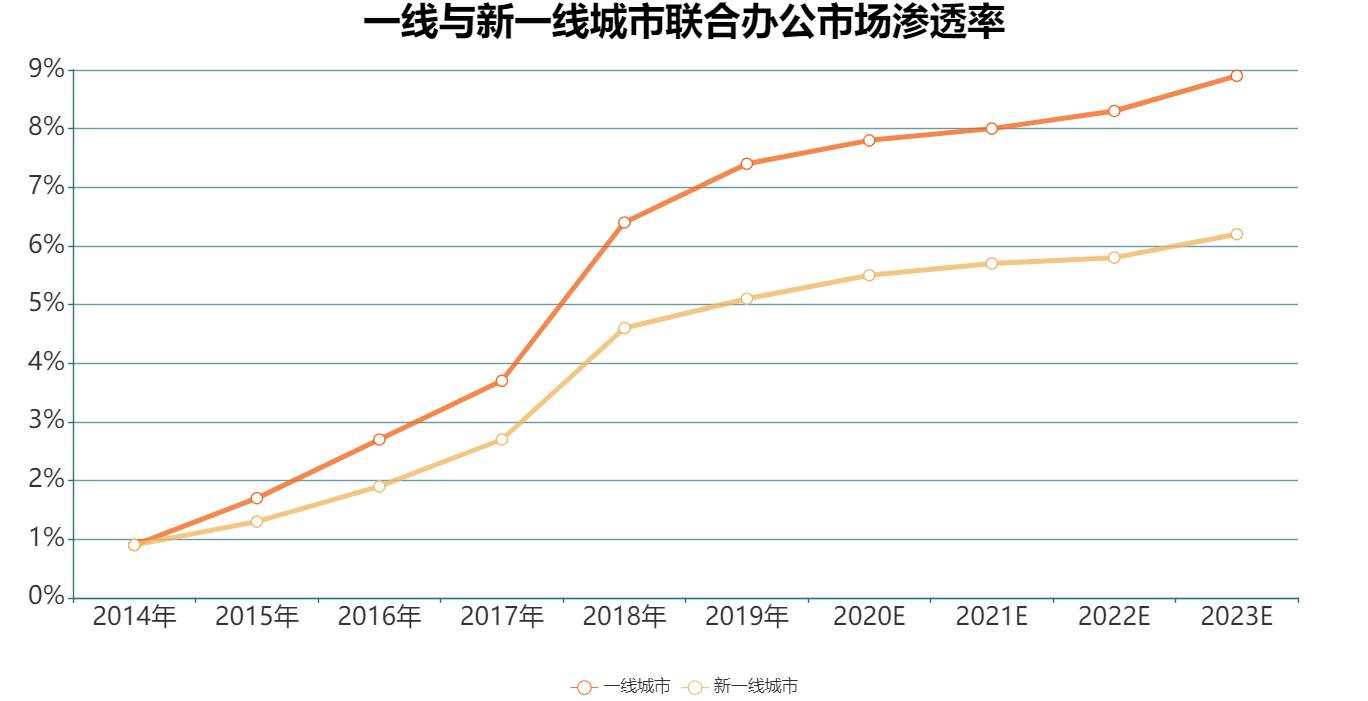 從滲透率來看,在發(fā)展初期,國內(nèi)一線與新一線城市的聯(lián)合辦公市場滲透率不足1%,2017年至2018年顯現(xiàn)出明顯的增長。2019年,一線城市聯(lián)合辦公市場滲透率已經(jīng)達(dá)到7.4%,預(yù)計2020年會進(jìn)一步提高。
