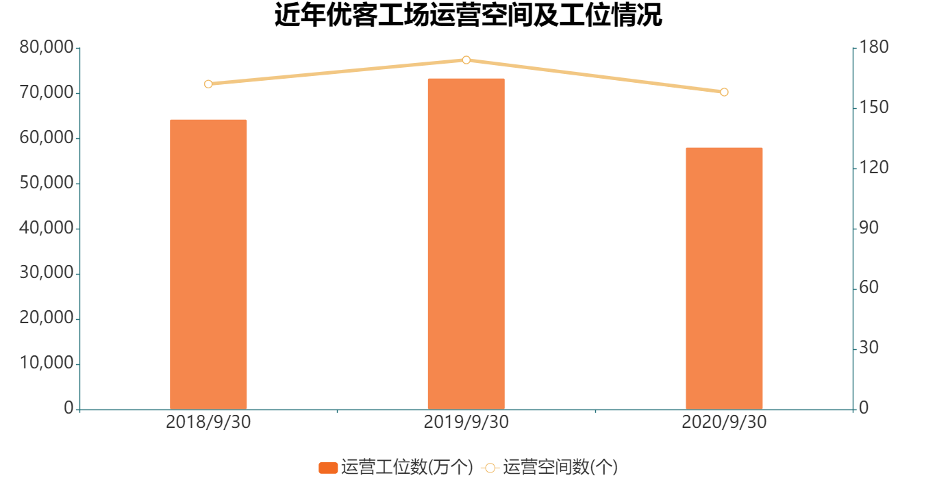 以優(yōu)客工場為例,截至2020年9月30日,優(yōu)客工場運營辦公空間數(shù)量達(dá)158個,較2019年底174個減少了16個,運營中的可用工位數(shù)量降至約5.8萬個,較2019年底7.3萬個減少了1.5萬個。