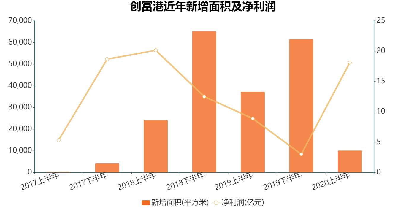 從創(chuàng)富港 2017 年上半年 -2020 年上半年的凈利潤和新增運營面積數(shù)據(jù)來看,當(dāng)期新增面積上升時,凈利潤會出現(xiàn)明顯下降;當(dāng)期新增面積下降時,凈利潤則回升。