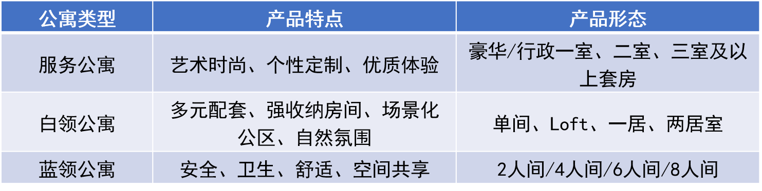 行業(yè)風(fēng)向的轉(zhuǎn)換,帶動(dòng)企業(yè)開拓更多產(chǎn)品線。根據(jù)目標(biāo)客戶消費(fèi)能力的高低,長(zhǎng)租公寓產(chǎn)品有著不同的定位,由上到下可以分為:高端服務(wù)型,中端白領(lǐng)型和低端藍(lán)領(lǐng)型三種。