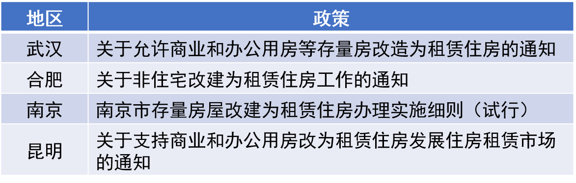 此外,各地政府還嘗試讓其他非住宅業(yè)態(tài)轉(zhuǎn)型進(jìn)入租賃市場(chǎng)。例如,一線城市許多辦公樓面臨著空置率過高的問題,一線以下的城市則更顯嚴(yán)峻。允許非住宅業(yè)態(tài)轉(zhuǎn)型租賃,亦是對(duì)存量物業(yè)資產(chǎn)盤活的一種新思路。