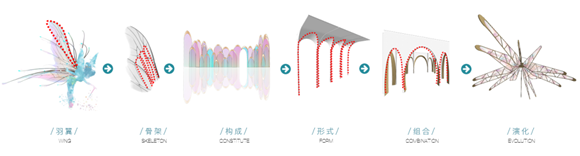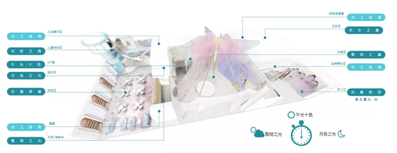 精靈奇緣的每段路程以光之翼的故事線展開,以精靈的羽翼、骨架為基礎(chǔ),組合、演化成不同的形式,讓不同的空間成為浪漫情感的容器??臻g亦是形態(tài)的載體,我們捕捉瞬間的靈感,激活想象力,打造出藝術(shù)化的情感空間。