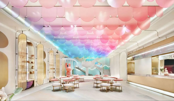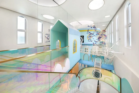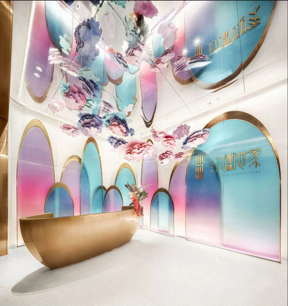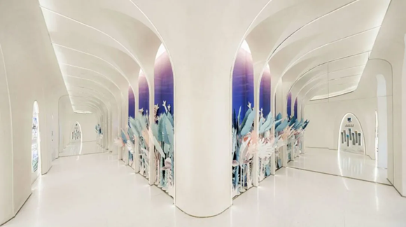 光翼銳變,通過數(shù)片炫彩藝術(shù)玻璃打造羽翼構(gòu)成的組合展廳,透過頂部的鏡面重疊交錯演化出振翅飛翔的那份驚喜。以光與翼為題,書寫精靈的過去與未來,從羽化到新生,讓每個到來的人心靈充盈著純凈與寧謐。