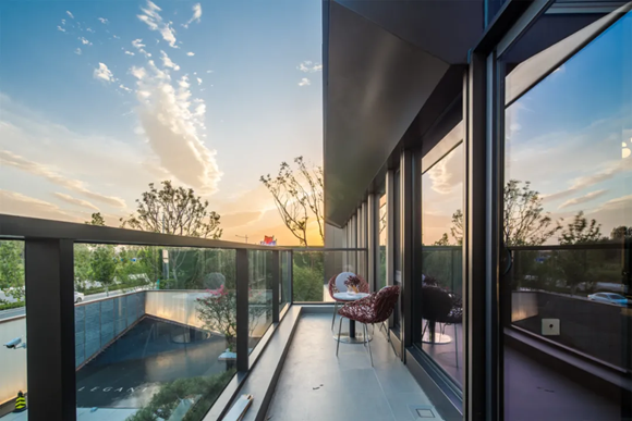 沿著青石板漫步至康橋美廬灣樣板間,高大的建筑逐漸映入眼簾。獨(dú)特的L型咬合結(jié)構(gòu),以及鋁板格柵和晶鉆玻璃幕墻的巧妙組合,帶來強(qiáng)大的視覺沖擊,令人眼前一亮。
