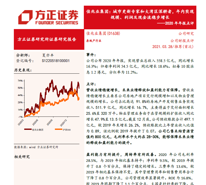 根據(jù)佳兆業(yè)2020年年報(bào),公司報(bào)告期內(nèi)實(shí)現(xiàn)營(yíng)業(yè)總收入558.5 億元,同比增長(zhǎng)16.3%;歸母凈利潤(rùn)54.5億元,同比增長(zhǎng)18.6%。鑒于佳兆業(yè)已售未結(jié)資源貨值約800億元,毛利率水平大約在28-30%,方正證券認(rèn)為,這能夠保障公司未來(lái)業(yè)績(jī)的釋放和盈利能力的提升。