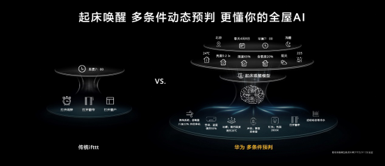 在具體應(yīng)用中,華為全屋智能的AI體驗優(yōu)勢明顯。以動態(tài)預(yù)判能力為例,在清晨喚醒場景下,傳統(tǒng)IFTTT采用單一條件,被動觸發(fā),線性聯(lián)動,強制喚醒;華為全屋智能采取多條件預(yù)判,主動動態(tài)感知溫度、濕度、含氧量、光線等要素;結(jié)合人體狀態(tài)如手表傳過來的睡眠習(xí)慣數(shù)據(jù)和時間、地理、氣候等多達(dá)10種網(wǎng)絡(luò)數(shù)據(jù),通過AI引擎計算,完成多條件預(yù)判,觸發(fā)相關(guān)設(shè)備和系統(tǒng),將氣溫、濕度、光線、音樂、水溫等調(diào)整到最舒適狀態(tài),讓用戶感受舒適喚醒。