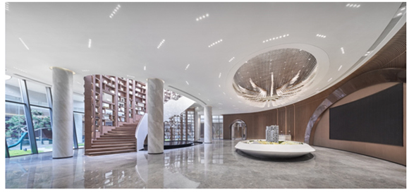 CITY PARK空間藝術(shù)館內(nèi)設(shè)會所接待區(qū),以自然為本的未來生態(tài)理念設(shè)計,空間環(huán)抱式將綠植引入室內(nèi),大面玻璃幕拉近景觀與室內(nèi)的關(guān)系,彷佛置身于自然環(huán)境之中,給予到場嘉賓身心愉悅。園林美景與水系自然一體,極具美感的山水相融的藝術(shù)空間,嘉賓無不沉浸在此云山人居理念構(gòu)建的云境中,對云境描繪的高品質(zhì)生活充滿無盡期待。