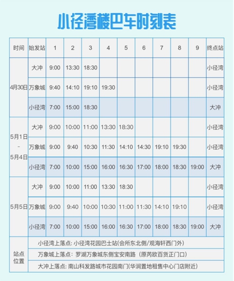 備注:僅為2021.5.1-2021.5.5樓巴車時刻表,具體更新調(diào)整請關(guān)注華潤小徑灣微信公眾號,了解最新樓巴車信息。