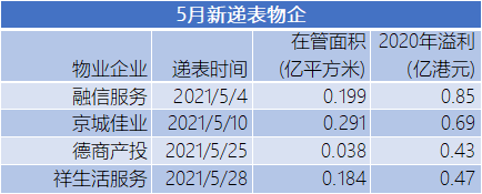 月內(nèi)共4家物企向港交所提交了招股說明書,分別為融信服務(wù)、京城佳業(yè)、德商產(chǎn)投與祥生活服務(wù),在管面積分別為1990萬平方米、2910萬平方米、380萬平方米以及1840萬平方米。其中,融信服務(wù)為招股書過期后的二次遞表,并已于6月11日通過港交所上市聆訊。