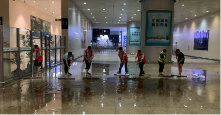 一大批旅客因大量積水滯留鄭州東站,碧桂園服務(wù)組建志愿者服務(wù)隊到現(xiàn)場清理積水和垃圾,保障高鐵站站內(nèi)秩序。