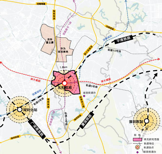 在龍崗“一芯兩核多支點(diǎn)”發(fā)展戰(zhàn)略中,五和樞紐片區(qū)在未來深圳城市發(fā)展中具有重要戰(zhàn)略地位。五和樞紐城市更新項(xiàng)目匯聚了包括兩條地鐵、三條城際在內(nèi)的五條軌道線,將連通粵港澳大灣區(qū)所有核心城市,區(qū)域輻射能力極強(qiáng)。五和樞紐作為深圳市客流量第三的交通樞紐(僅次于前海和深圳北樞紐),將成為大灣區(qū)核心城際樞紐之一。深圳正式迎來“雙區(qū)驅(qū)動(dòng)、雙區(qū)疊加”的黃金發(fā)展期,五和片區(qū)的坂雪崗科技城是廣深港澳科創(chuàng)走廊的關(guān)鍵錨點(diǎn),五和樞紐城市更新項(xiàng)目將推動(dòng)灣區(qū)創(chuàng)新要素高效流動(dòng)。
