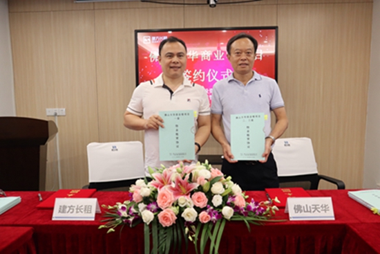 周松董事長代表廣東建方房屋租賃管理有限公司與李耀榮董事長代表佛山市天華投資有限公司正式簽約。